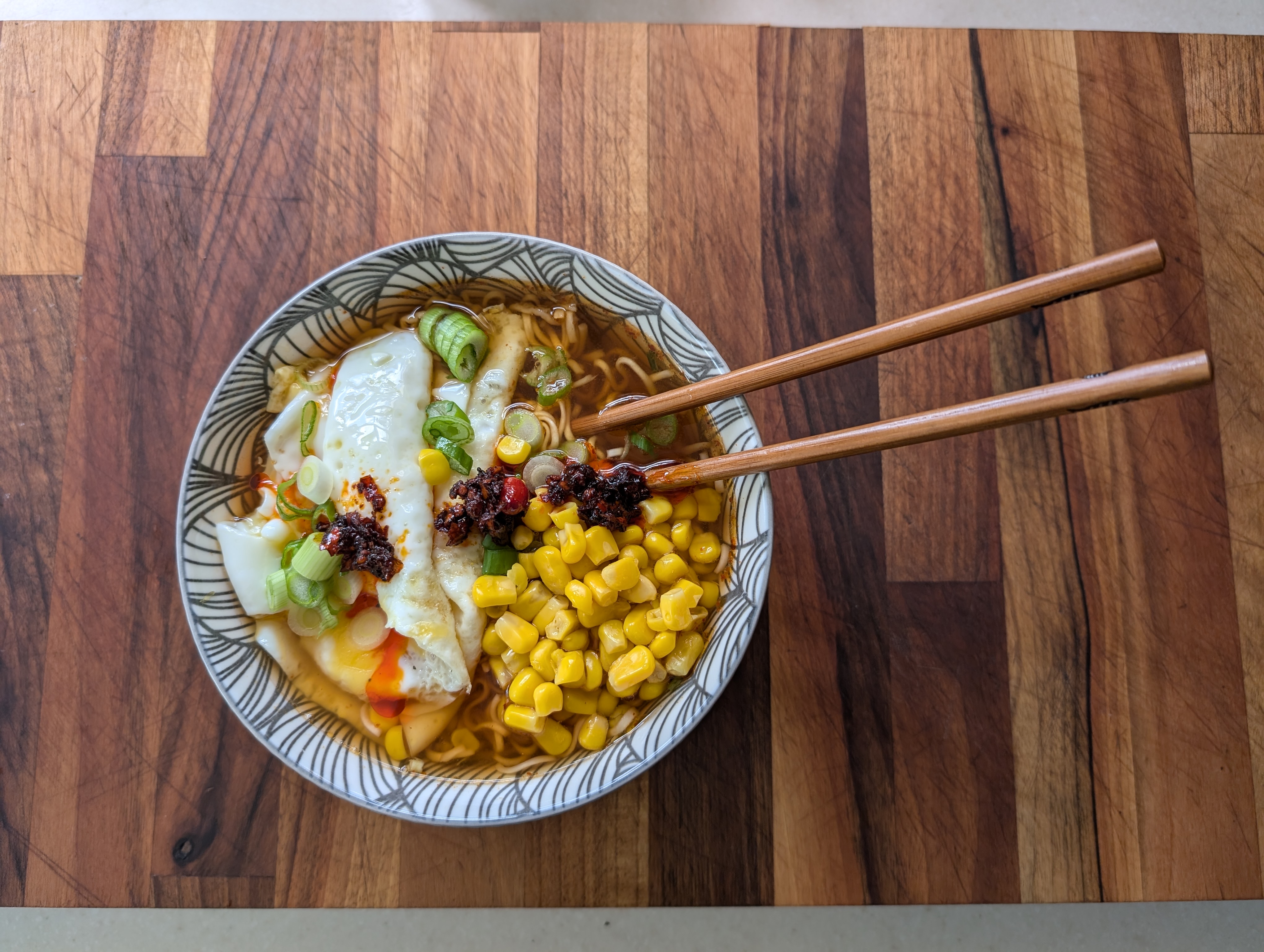 I’ll close out with some enhanced ramen. Packet ramen topped with fried eggs, sweetcorn, sliced spring onion, and chillies in oil. It’s still making my mouth water.