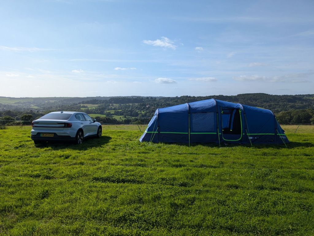 The Polestar 2 capacity has been pushed to the limit. Fitting our Berghaus Air Nightfall tent is no mean feat, and once all the tent paraphernalia is in, there isn’t much space for any human occupants. It was a comfortable drive up the A38 and M5 to get here, and something of a novelty being so close when we’re used to losing half a day to travel.