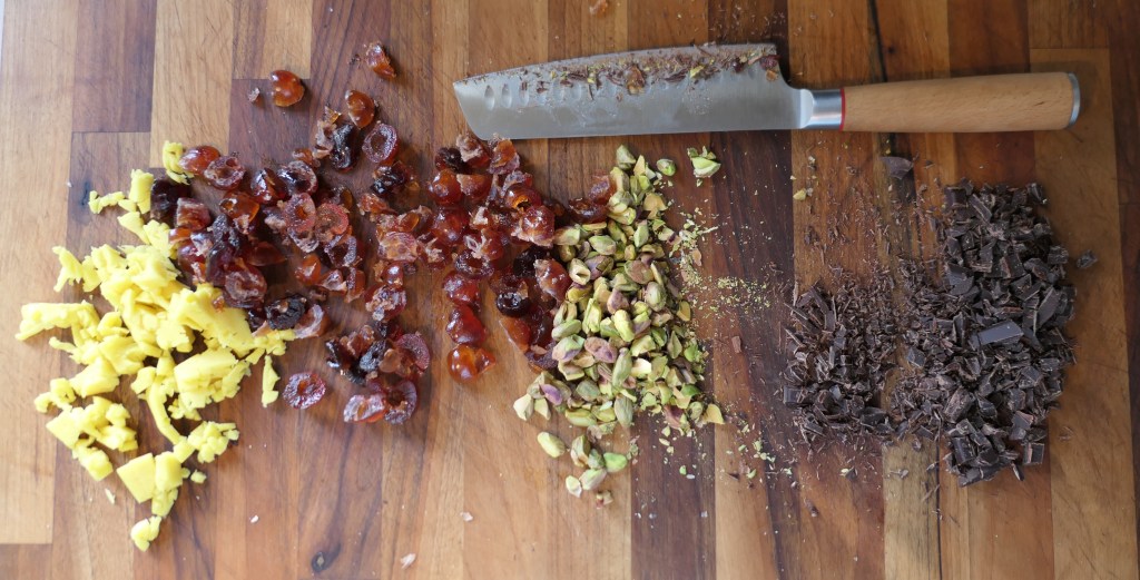 Once the mixture was well combined, I added chopped marzipan, glace cherries, pistachios, and dark chocolate. The result was poured into a 2 pound loaf tin lined with cling film, and placed in the freezer to set. Before serving I’ll drizzle it with melted dark chocolate and top with some more glace fruit.
