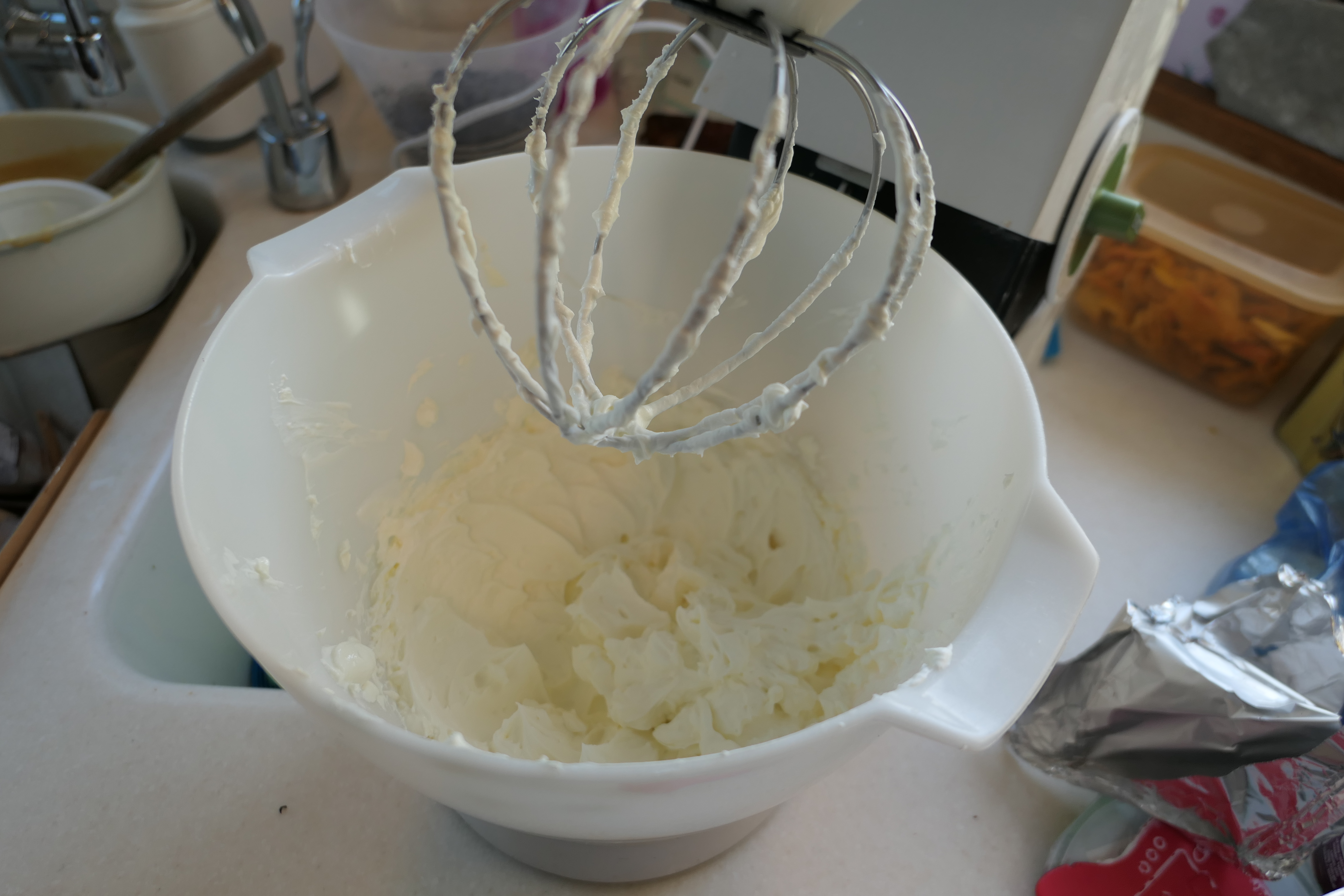 Turns out if you have a tin of evaporated milk laying around, you can turn that into condensed milk with the addition of sugar, heat, and time. Not too much heat as I discovered rapidly after burning the first try, and more time than you’d think. It’s about evaporating off as much of the water as possible leaving a thick, gloopy mixture with a slightly caramalised colour. It’s remarkably similar to the shop bought stuff. Once I had that, it was just a matter of using the mixer to beat ricotta, then mascarpone followed by the condensed milk.