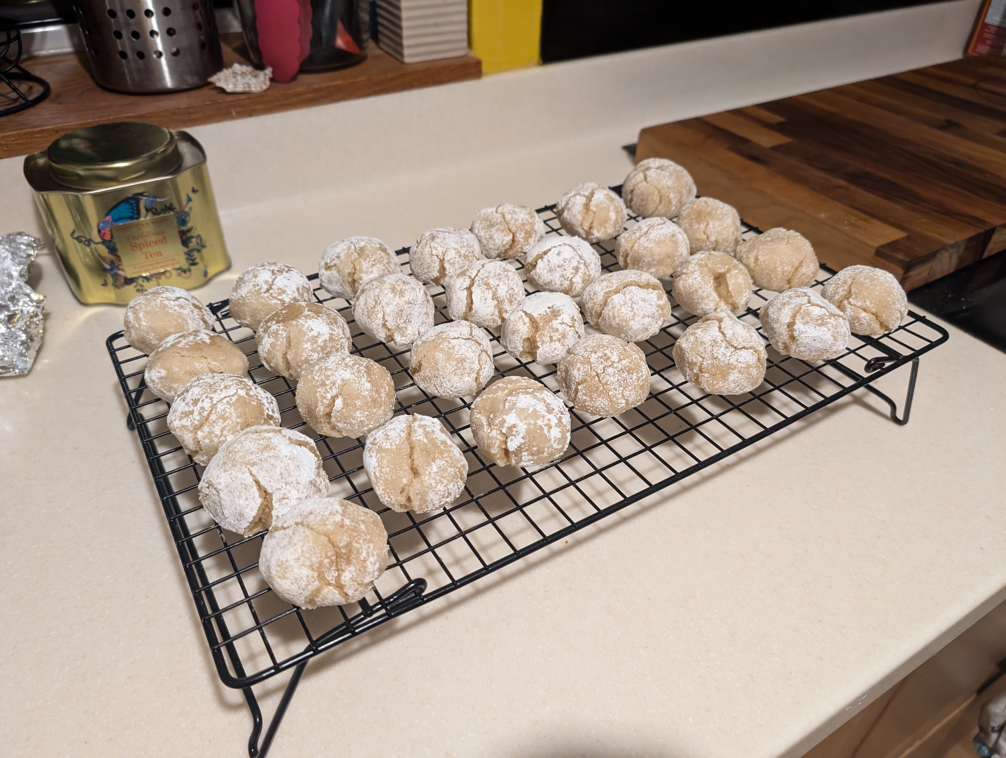 It’s that time of the year when I decide to camp out in the kitchen. I love the cooking and baking that the festive season brings, and one of my holiday specials is amaretti. In particular a softer version than the commercial classics. They are easily made and don’t require many ingredients or specialist equipment. Egg whites, ground almonds, caster sugar, icing sugar, vanilla extract, and amaretto/almond liqueur. I use the recipe from Charlotte’s Lively Kitchen. It’s rare that I find an online recipe that I can use without modification, but this is one that works well every time and scales well too.