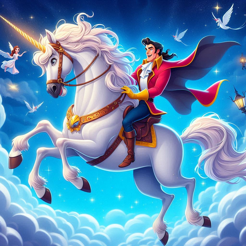 But Gaston’s horse was started and he crashed into a tree. A hand reached out to assist him, which he gratefully accepted, only to reel in horror when he realised it was attached to a violent-looking troll. Suddenly a unicorn appeared, whisking Gaston to safet