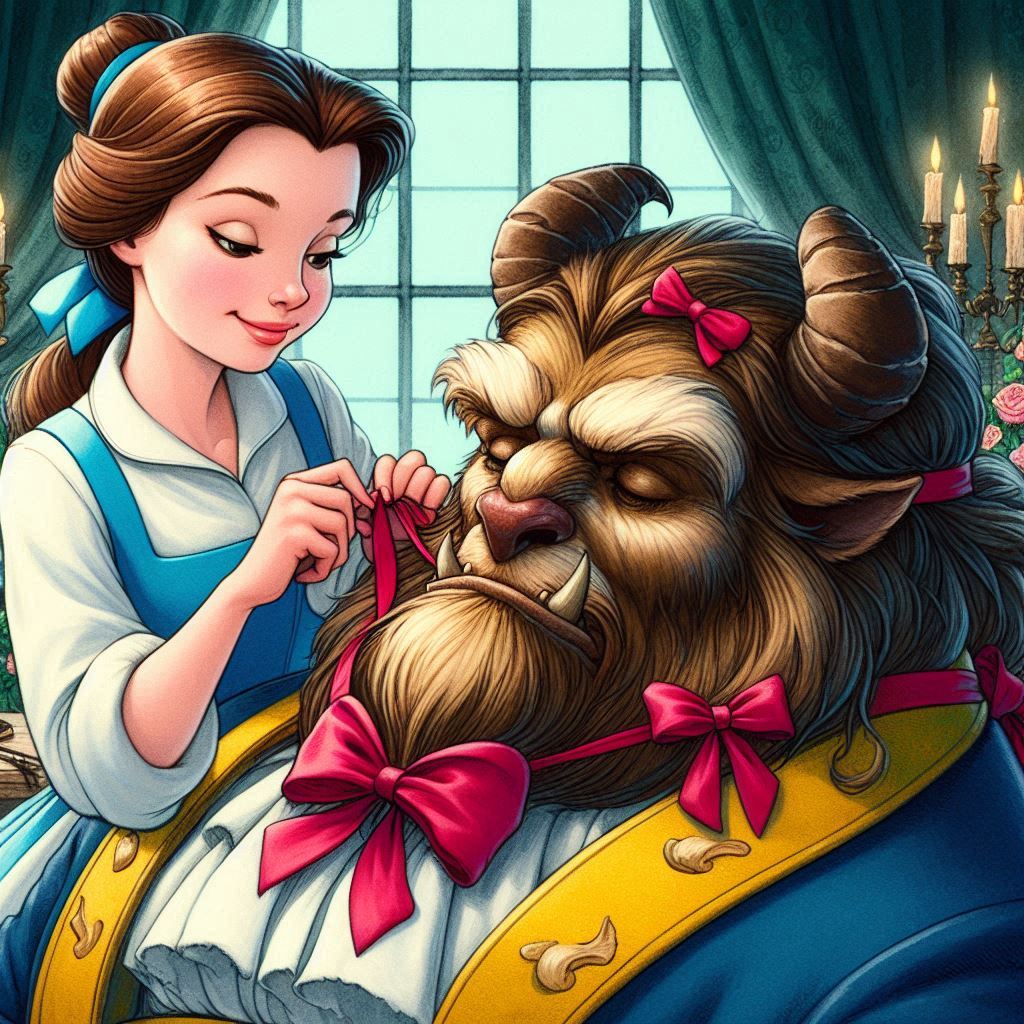 Once upon a time, the Beast caught Belle. Belle promptly escaped when the Beast was sleeping. Before she escaped, Belle put bow ties on the Beast’s beard.