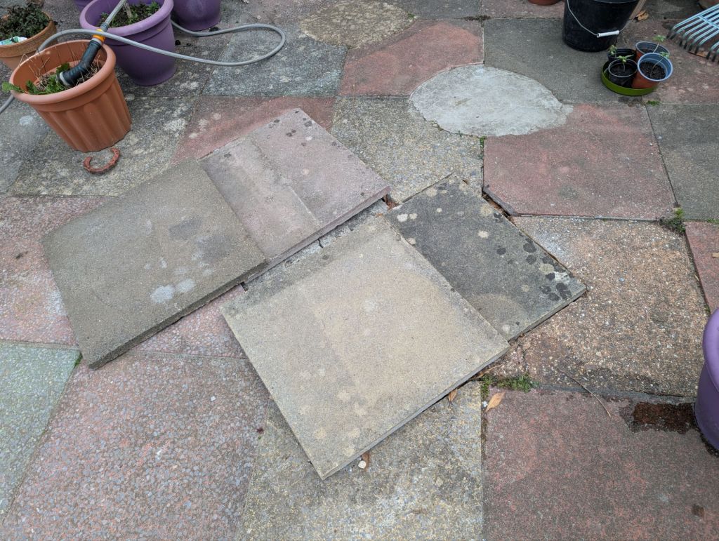 One job that has been on the cards since shed clearing last year was manhole cover replacement. The old covers were decaying reinforced concrete and an awkward size that was going to be expensive to replace. Thankfully a little work with a chisel accommodated some standard manhole covers. I opted for a recessed tray so that they can eventually be paved to match the new patio (once we decide on that option).