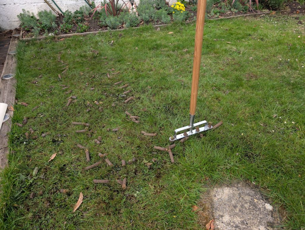 The other garden job is the lawn. I have been in two minds about how to manage the lawn. Intensively try to regrow the sad parts of it and focus on grass, or leave it to the wilds and see what happens. It’s a mixture of grass, moss, and weeds, so not quite golf course standard. This year I’m trying out the Lawn Pack to see if the results are too good to be true. I mean, they might be if the process was just sprinkling seeds and waiting. I’d hope it would be pretty good considering it involves spraying iron sulphate, raking out the moss, aerating the lawn, spreading top dressing, sprinkling grass seed (which has been mixed with the root enhanced), fertilising, and watering. And watering again. And some more. If it isn’t perfect after that, I’d be sorely disappointed.