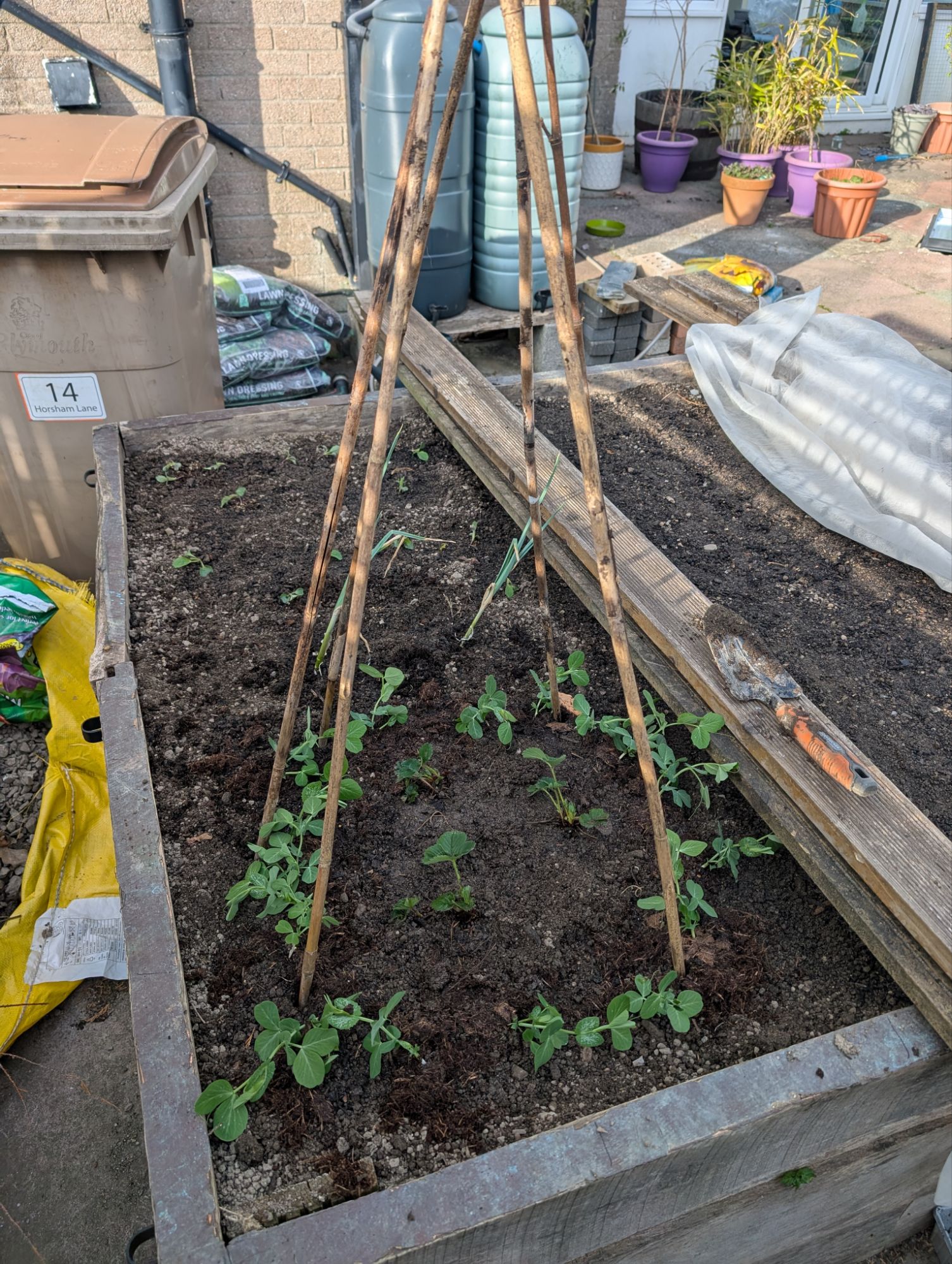The vegetable garden has progressed too. Using a square foot gardening approach has allowed me to plant it out fairly quickly, although I did break slightly with that convention for the pea plants. I put together a basic obelisk to give the pea plants support as they love to climb. I tend to take photos as I go as a way of documenting what has been planted where. It can become difficult to keep track what has been planted where across the two beds.
