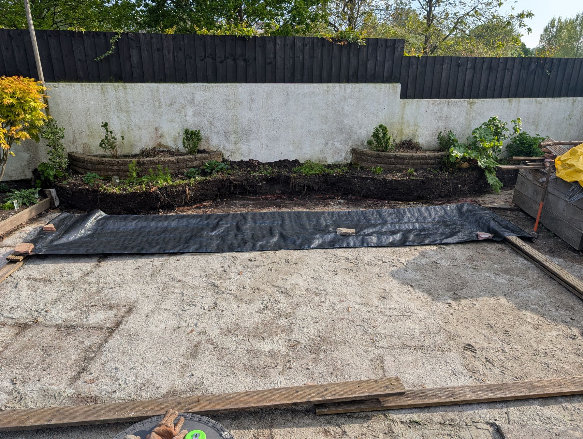The latest project involves building a big play area which will replace most of the old patio. If you remember from last year, I lifted a lot of the slabs to build the base for the metal shed last year.
