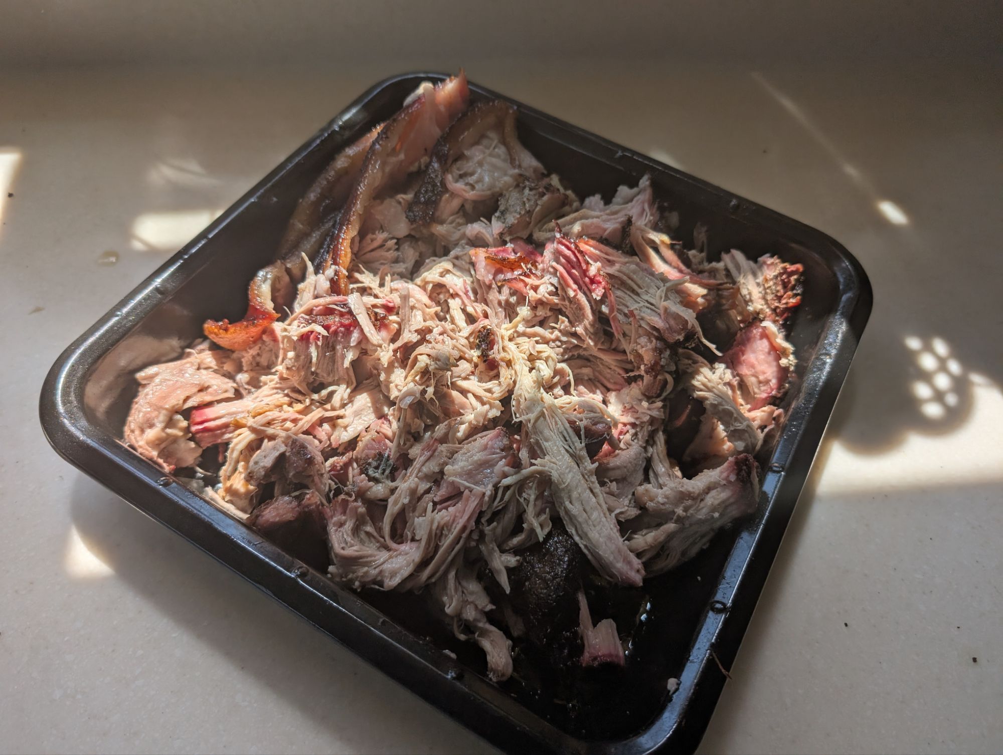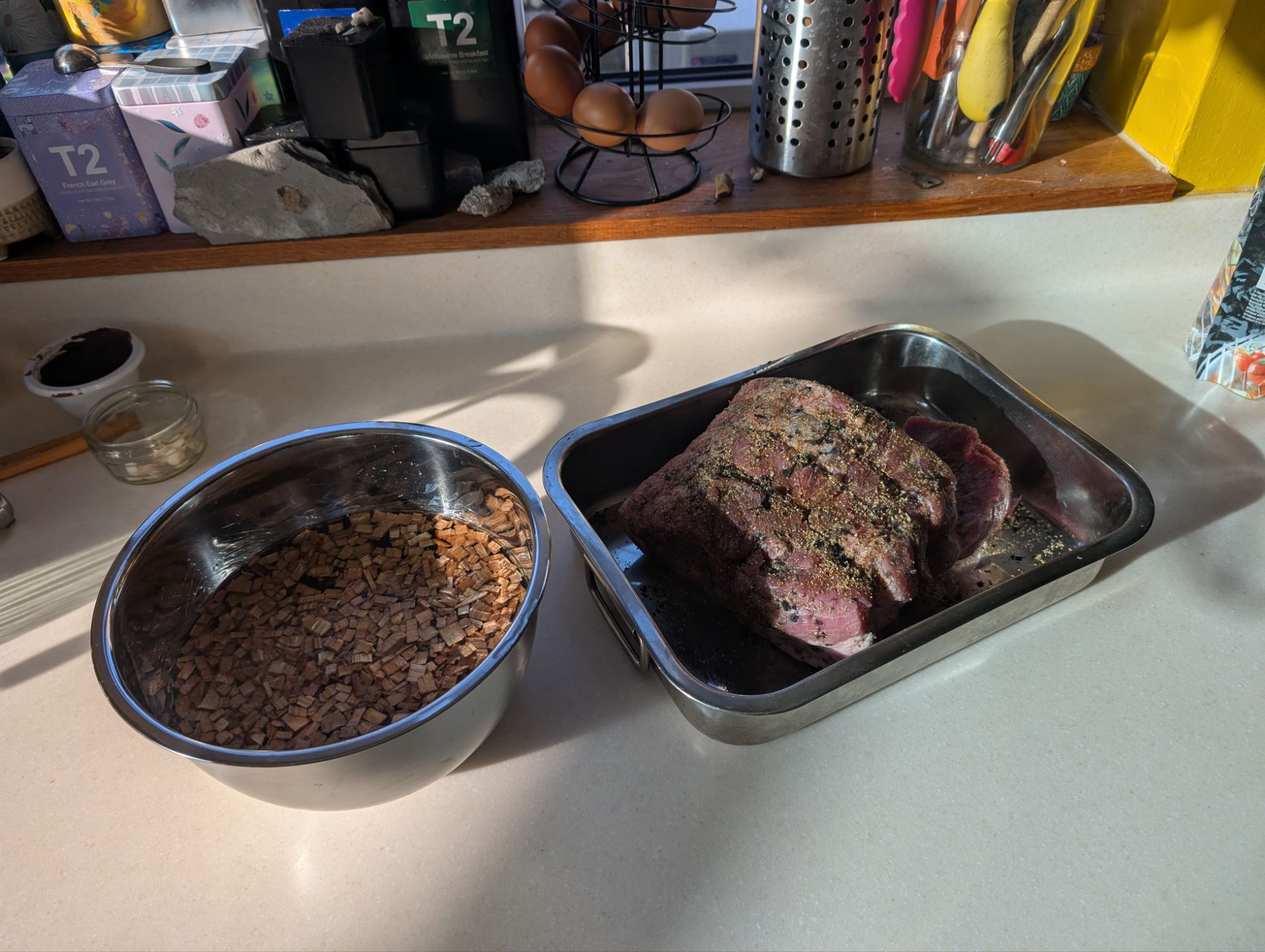 I made a quick dry rub for the pork with salt, sugar, and spices, then stuck it on in the morning, ready to check that afternoon. One thing I could benefit from is two half moon shaped drip trays (or perhaps kidney dishes!) to catch drippings.