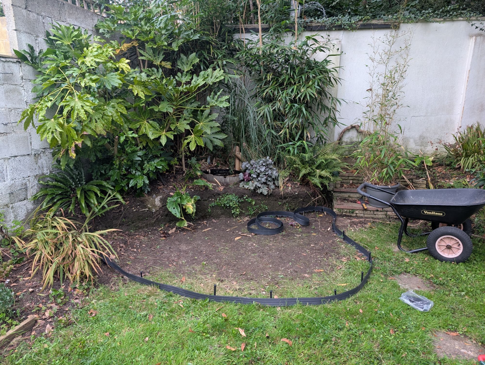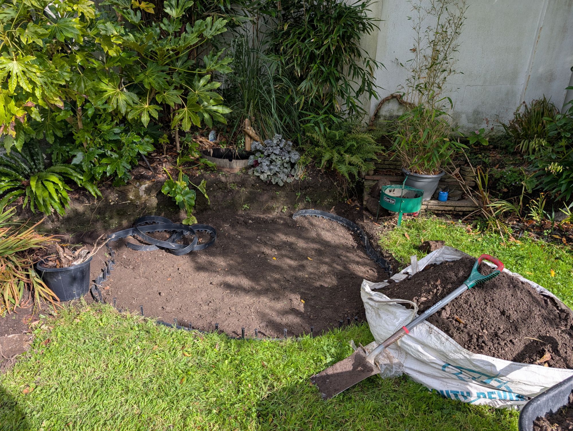 There’s no time to be idle in the sunny intervals. The zen garden corner is coming together slowly. Since the decking was removed the corner has been becoming overgrown and unruly. I was able to tame it this weekend and mark out the area for the stones.