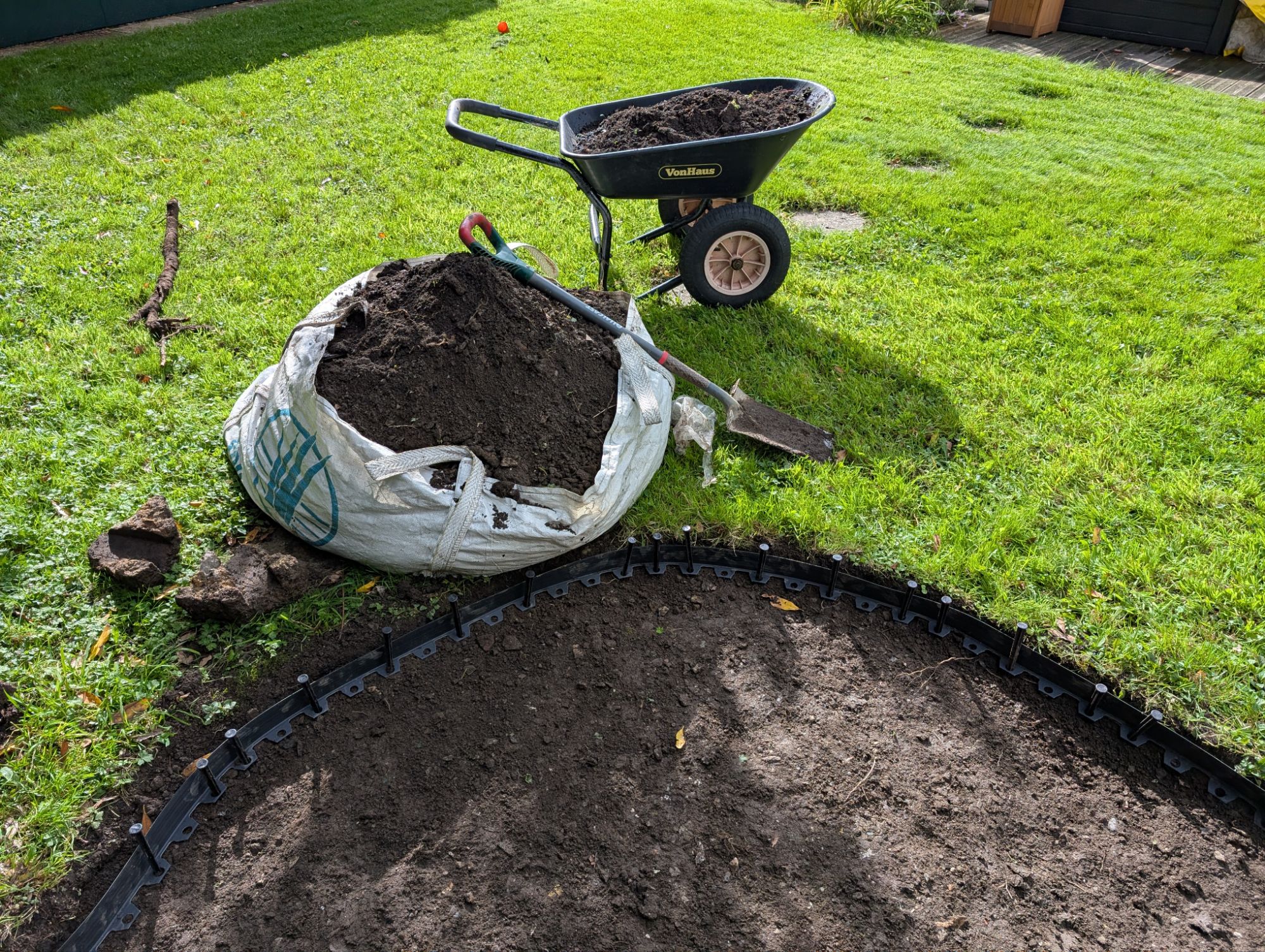 It’s amazing how much soil an apparently shallow depth generates. This has produced more than half a tonne, and that’s digging down to a depth of five to seven centimetres. The edging is some of Amazon’s finest and is designed to provide an almost seamless border between the grass and the stones. In practice that may not work flawlessly, but the effect will be interesting at the very least. This will work alongside the shishi-odoshi water feature to make a Japanese-inspired oasis of calm. Or something like that.