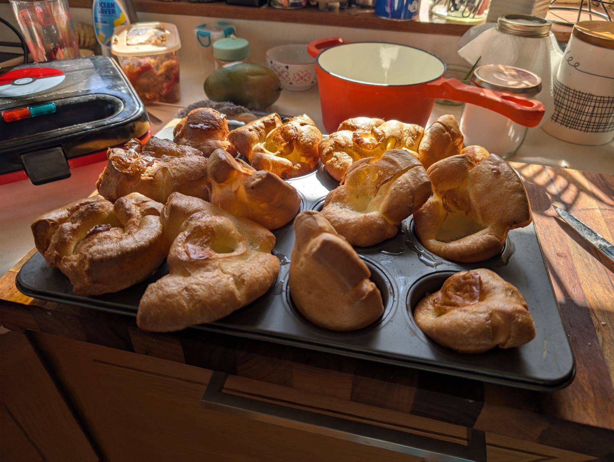 We’ve started watching Billy and Dom Eat the World on Amazon Prime with Billy Boyd and Dominic Monaghan (Pippin and Merry from Lord of the Rings). One of their food explorations involved a roast dinner, and the controversial approach of making Yorkshire puddings with a cold tin. I had always believed the key to making the puddings rise sufficiently was smoking hot oil, and managing the tin in that state was a challenge. Apparently a cold tin achieved as good a result according to the show. This was challenging my central cooking dogma, but being a scientist at heart, I endeavoured to keep an open mind.