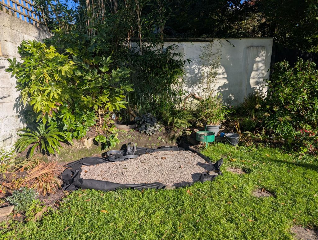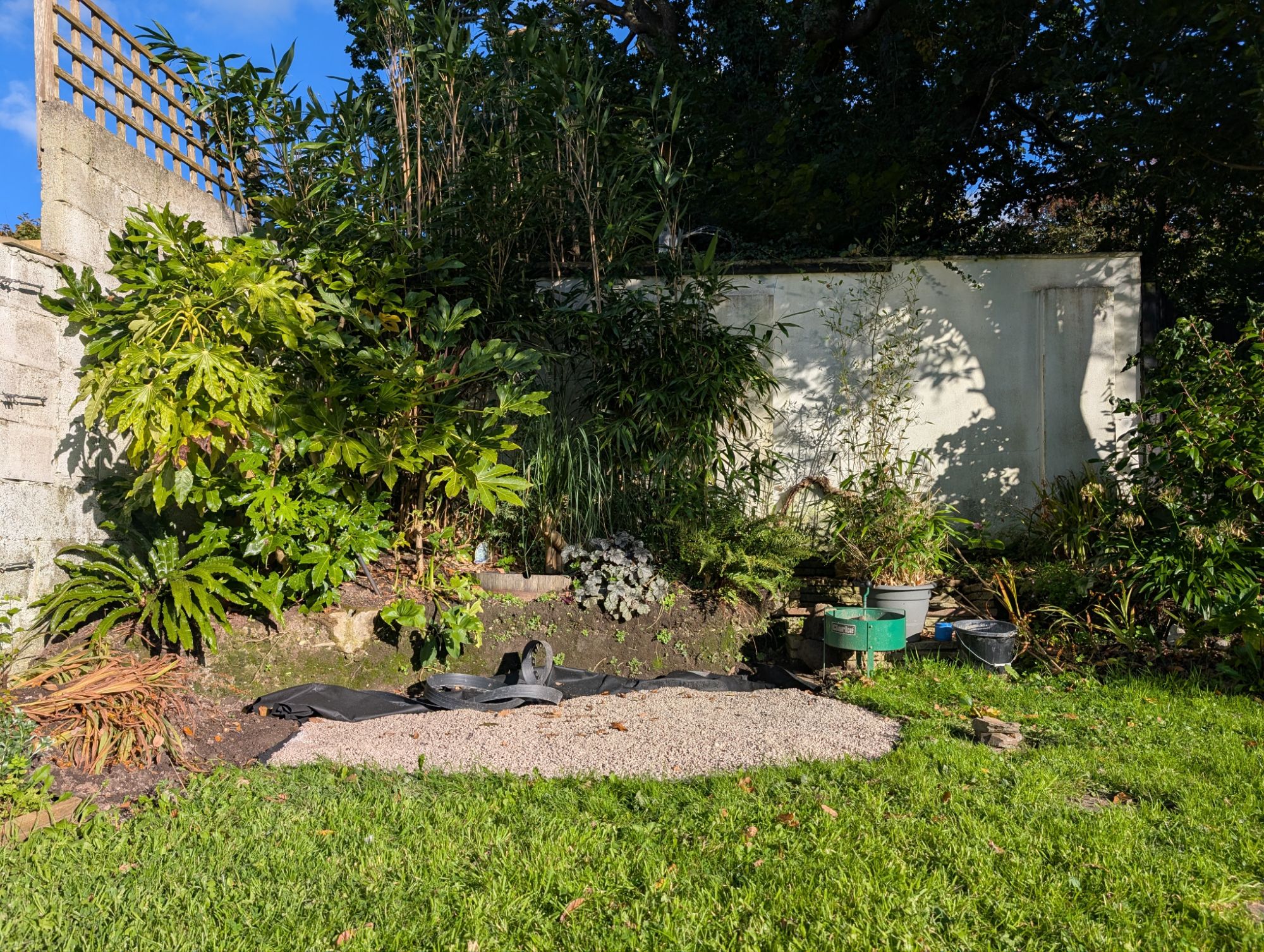 I spent some time working on the garden on a rare sunny afternoon this weekend. The zen corner is coming along slowly. I left off with the geotextile fabric still exposed at the border with the grass, with the aim of creating as seamless a transition as possible. Autumn started to prove slightly challenging as leaves are already falling and covering the stones. Luckily the maintenance of a zen garden involves raking…