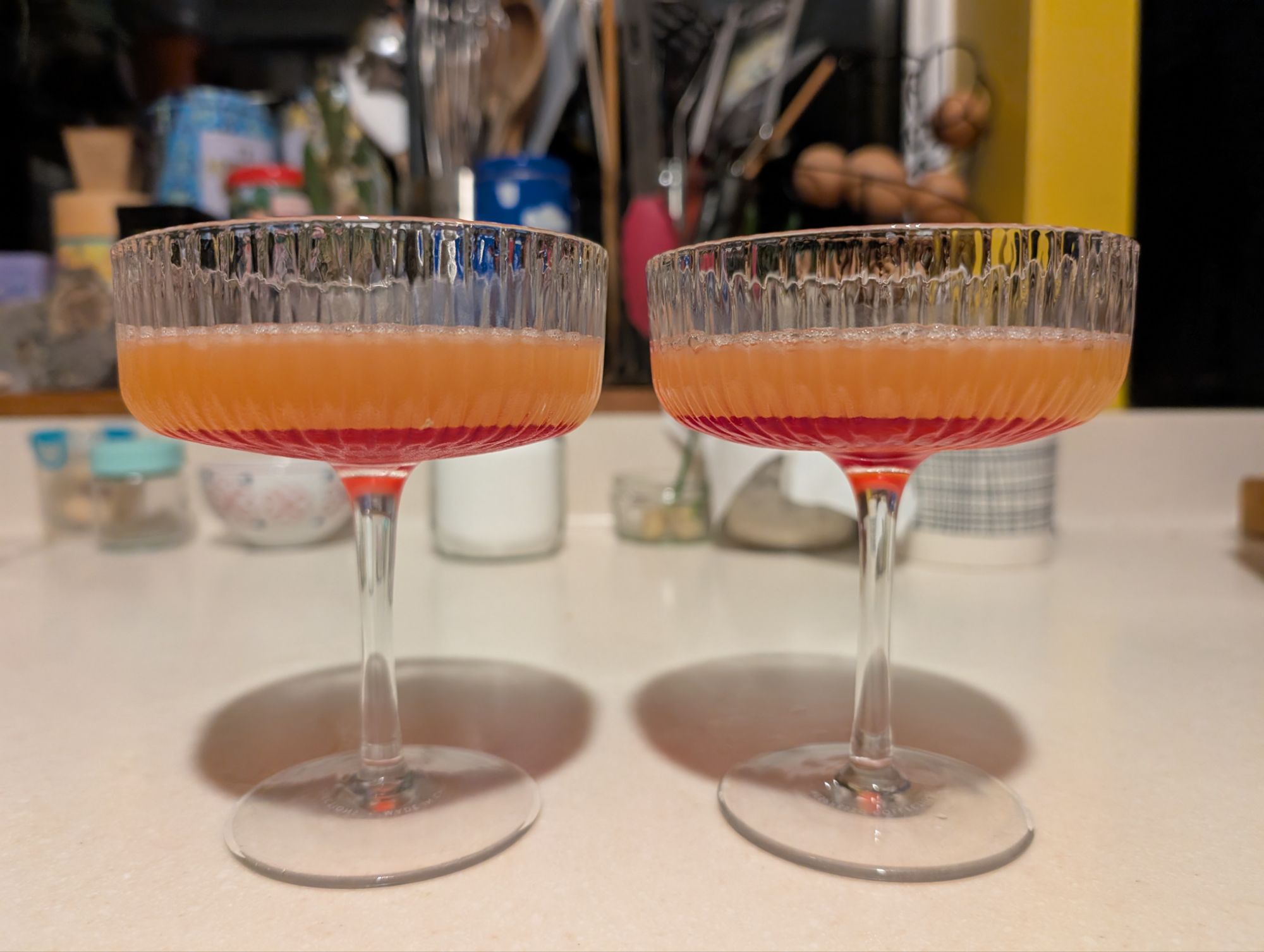 We have had two dodgy batches of easy peeler oranges from Tesco in recent days. They look and feel perfectly fine until peeled, then they rear their sorry-looking, dehydrated segments. Compost, then? Nope. When life gives you crappy oranges, juice them. Today they have gone into a Sunrise Sour. This bourbon-based cocktail combines whiskey with simple syrup, lemon and orange juice, and grenadine for dramatic effect. The grenadine is poured over the back of a spoon to layer neatly on the bottom. It’s a pleasant juicy take on the traditional whiskey sour, and looks great too.