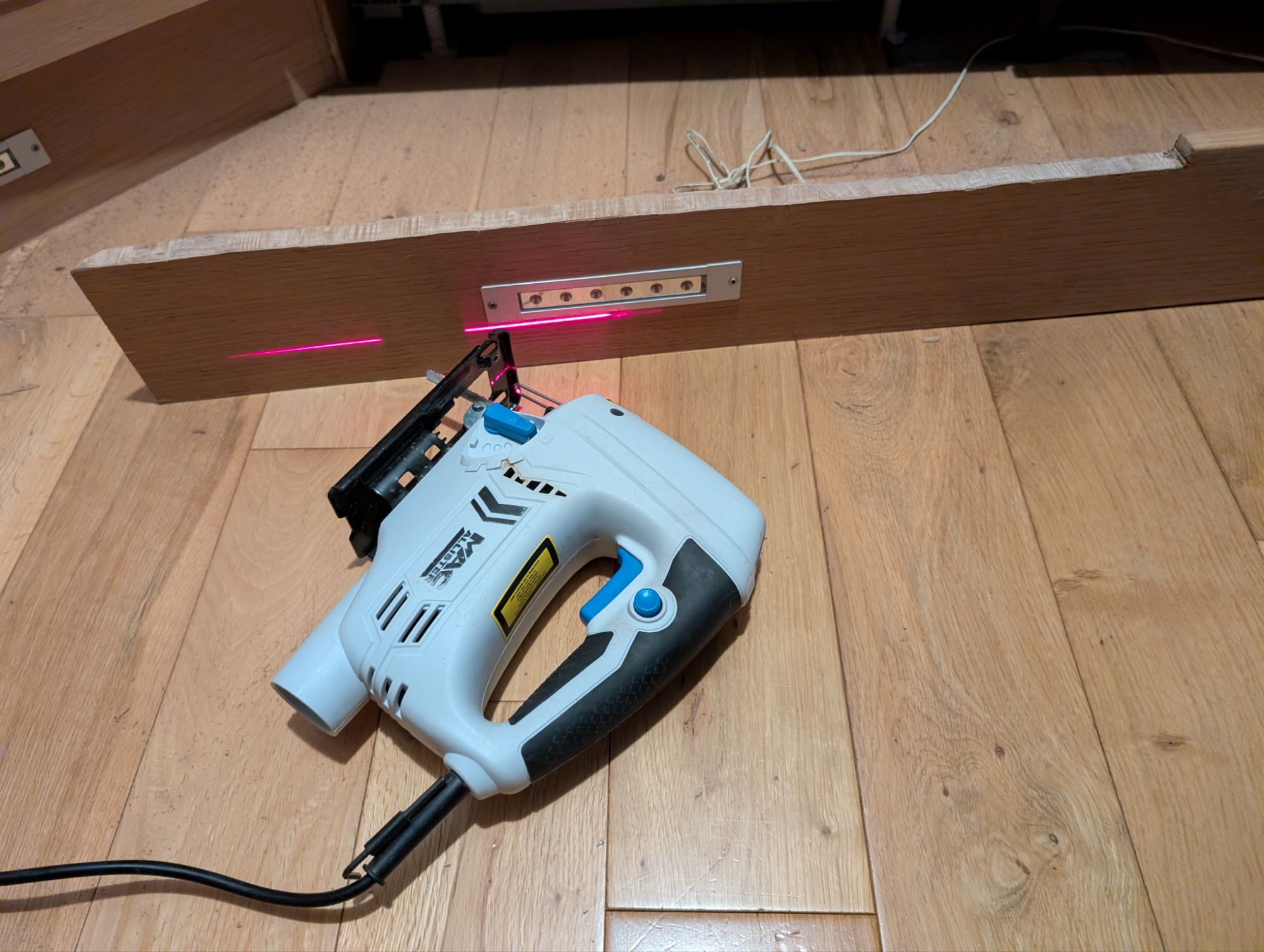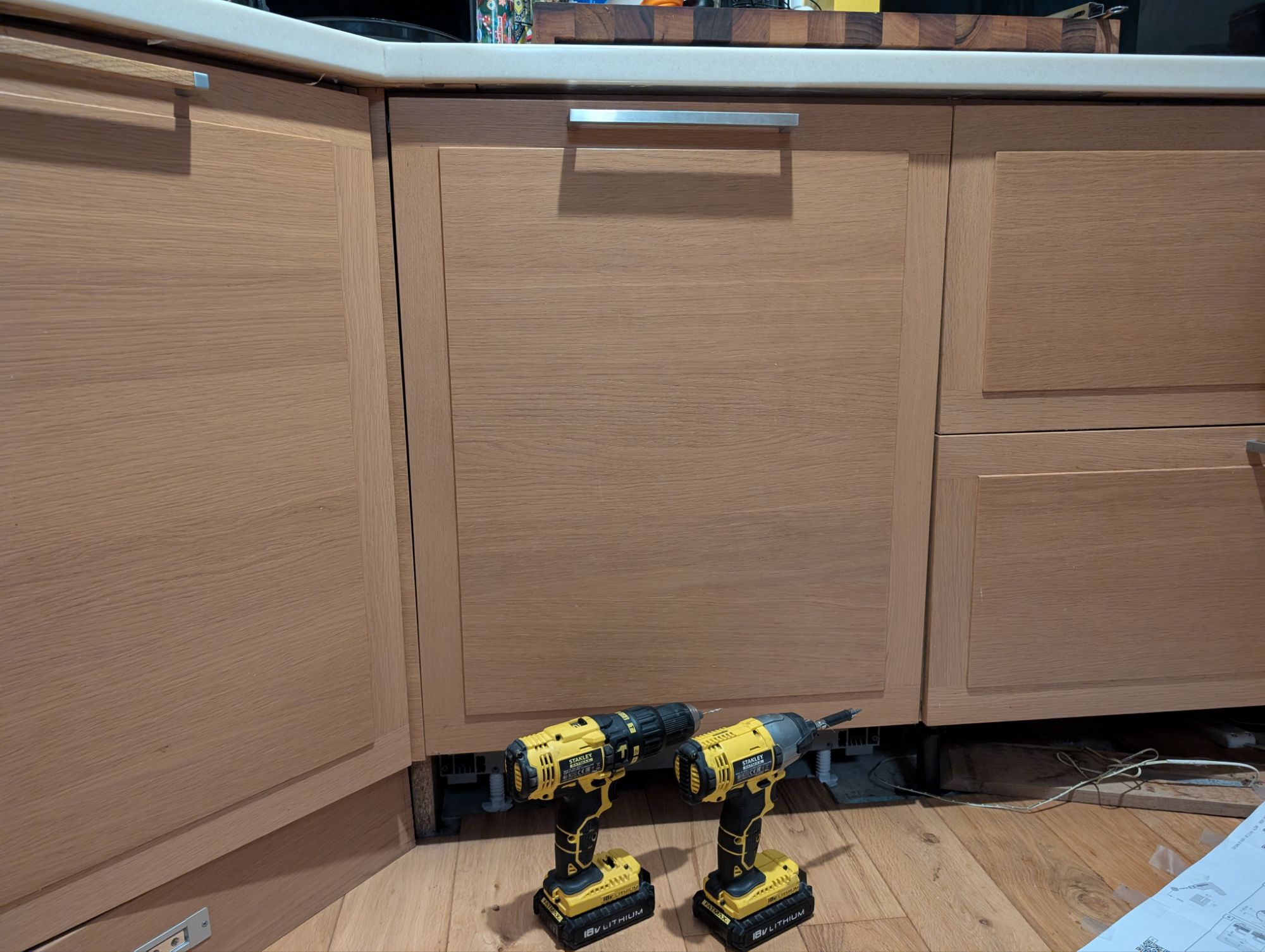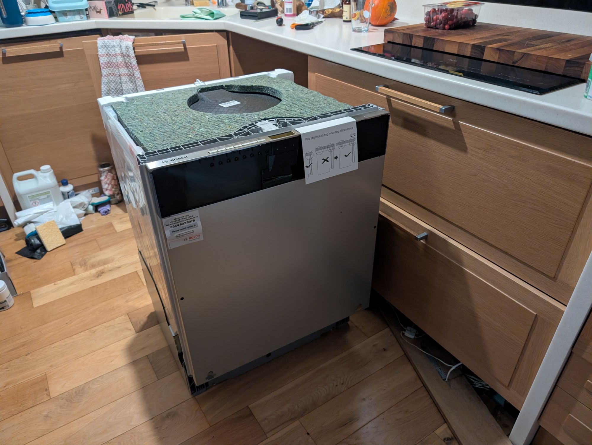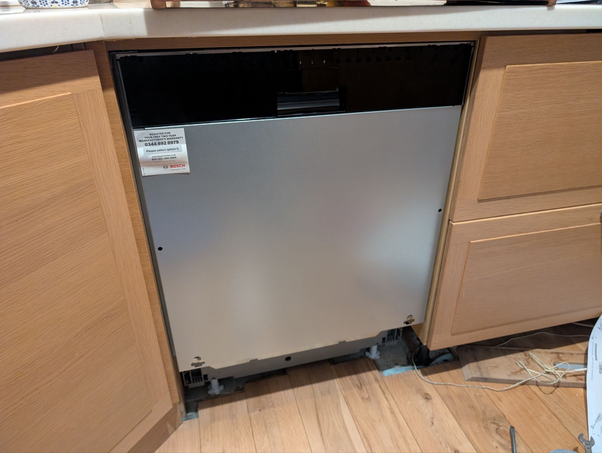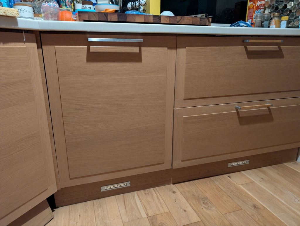So I gave in and ordered a replacement from Bosch. This required some learning to figure out how integrated dishwashers are installed. I learned how to remove them in the process of taking out the old one, and how to level them and ensure a snug fit. Unfortunately the rest of our kitchen is a bit wonky, so when it came to fitting the old door it was more of an art than a science. I used the template and ended off needed a 2cm adjustment (no idea how I was that far off), but the adjustment worked perfectly. The board under the dishwasher needed a 1-2mm trim (a shave with the jigsaw did the trick) and everything slotted nicely back into place.