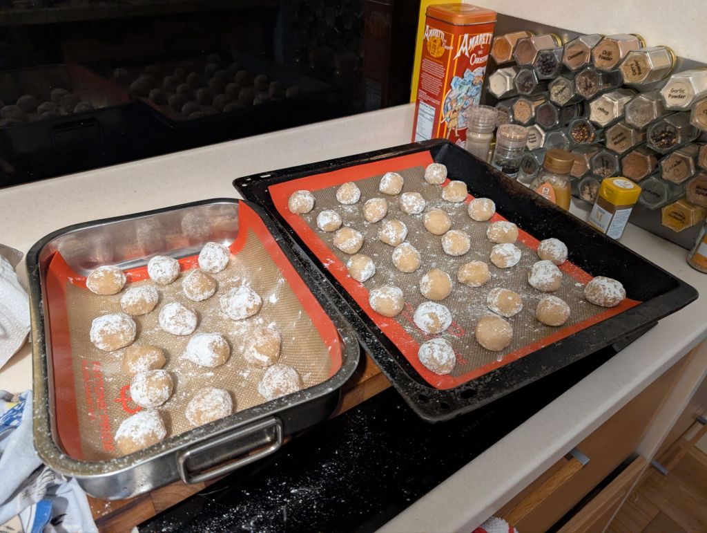 Christmas has always been a time associated with frantic cooking and baking in my experience. This year is no different, and we’re kicking off with amaretti, my go-to for baked gifts. The recipe is reliable, and found here on Charlotte’s Lively Kitchen.
