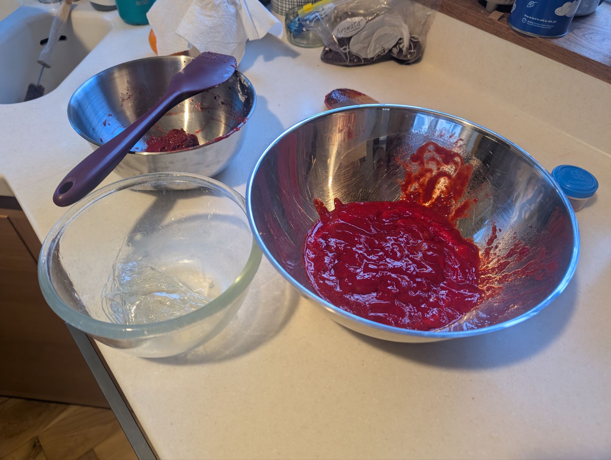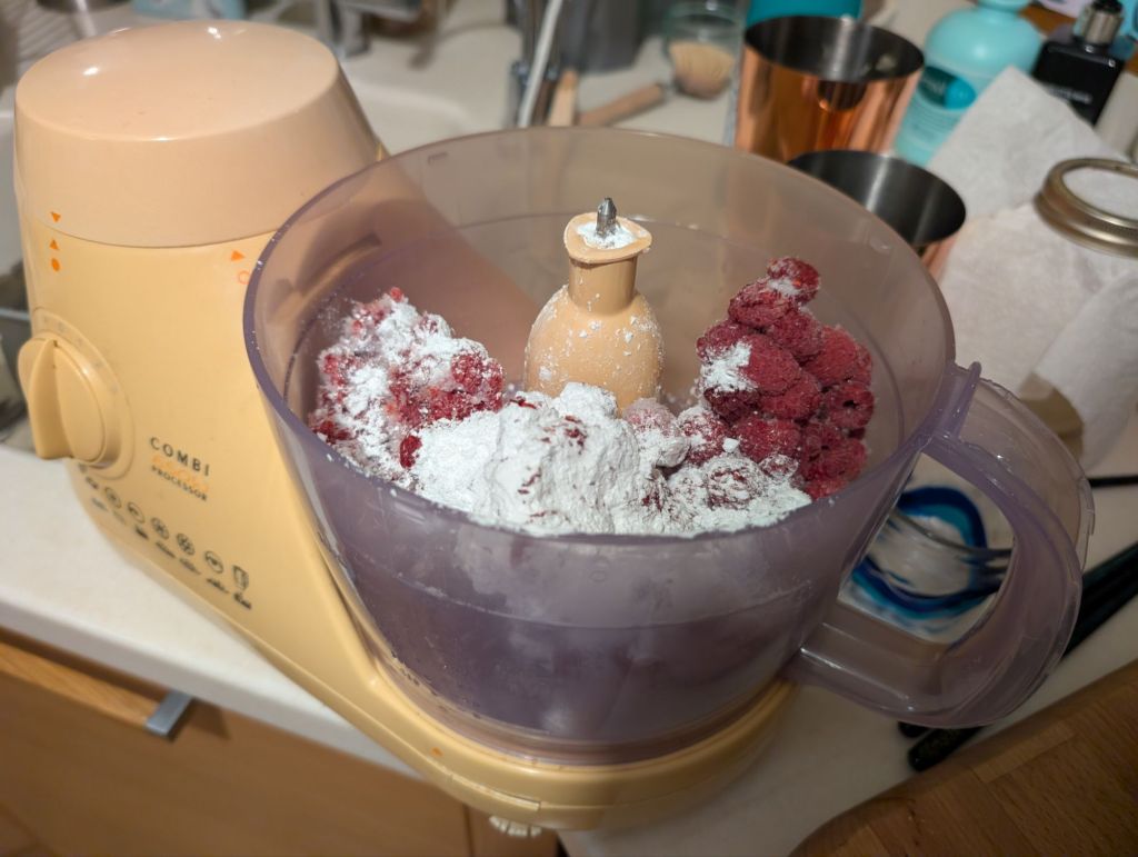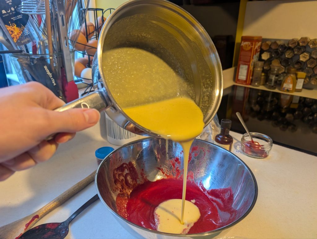 This year I attempted to recreate the glory days of my baking, but due to a swiss roll malfunction (lack of tins, dodgy recipe), the sponge was much too thin and had a weird texture. I managed to assemble it but it was less impressive. The scale of the operation was quite something though. First I made a raspberry puree which I added to some homemade custard. This mixture was combined with gelatine to create the bavarois for the filling.