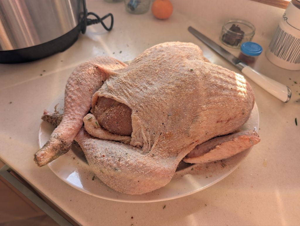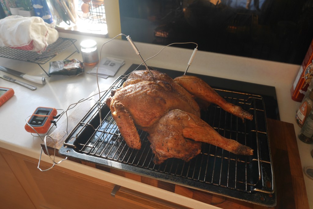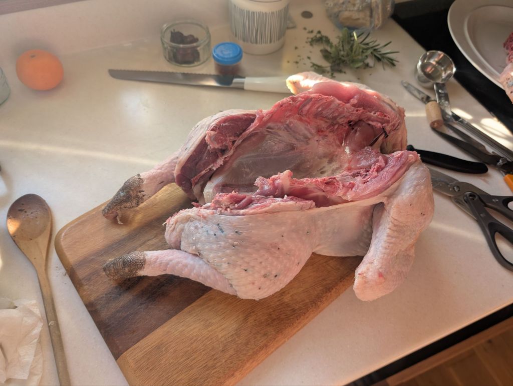 The first step, as in any cooking endeavour, is to get hold of quality ingredients. Does your turkey always disappoint? If you buy the cheapest possible one, it’s more than likely going to taste cheap. That’s not to say there isn’t a ceiling on the price. You can spend a lot more for relatively little benefit, but there are other considerations including organic and free range animals if you take animal welfare into consideration. I tend to spatchcock turkey to give a more even surface area for cooking. The biggest advantage is that a 4.7kg turkey can cook in less than an hour with this method. I opted for a dry brine rather than wet brine this year for a change, which gave exceptionally crispy skin but I did miss the additional moisture added by the wet brining.