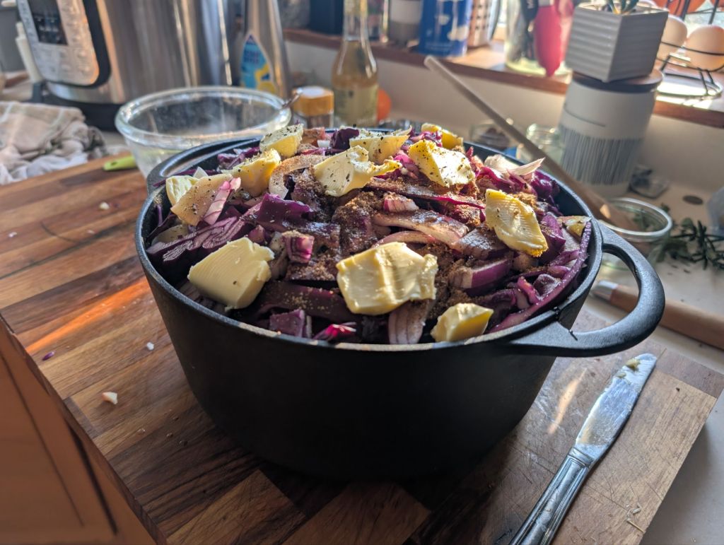 Another traditional side for us is braised red cabbage. I used a Delia Smith recipe which worked well, although I made far too much. The lid just about fit on it. It could have done with some heavier spicing too, and more apple.