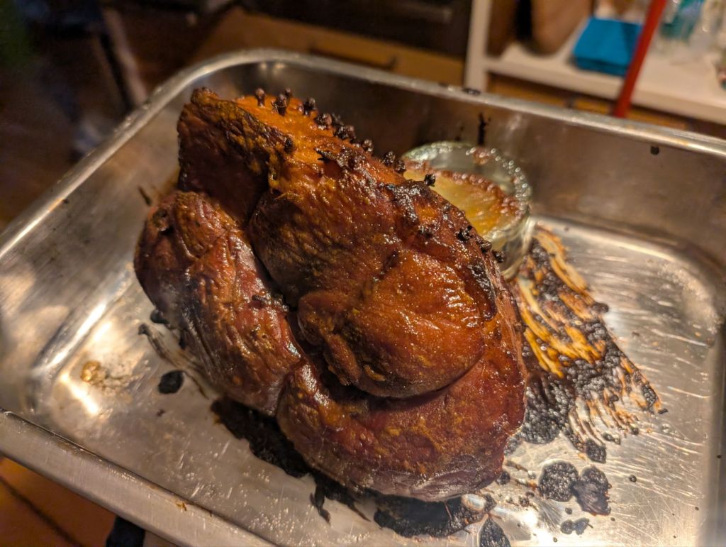 I don’t have a great picture of the ham, but this year I went for one simmered in cola and glazed with a honey, mustard, and maple sauce concoction. The flavour was great, but I think the recipe over-egged the cooking time considerably. I don’t cook ham much the rest of the year so this is an area I need a bit more experience in.
