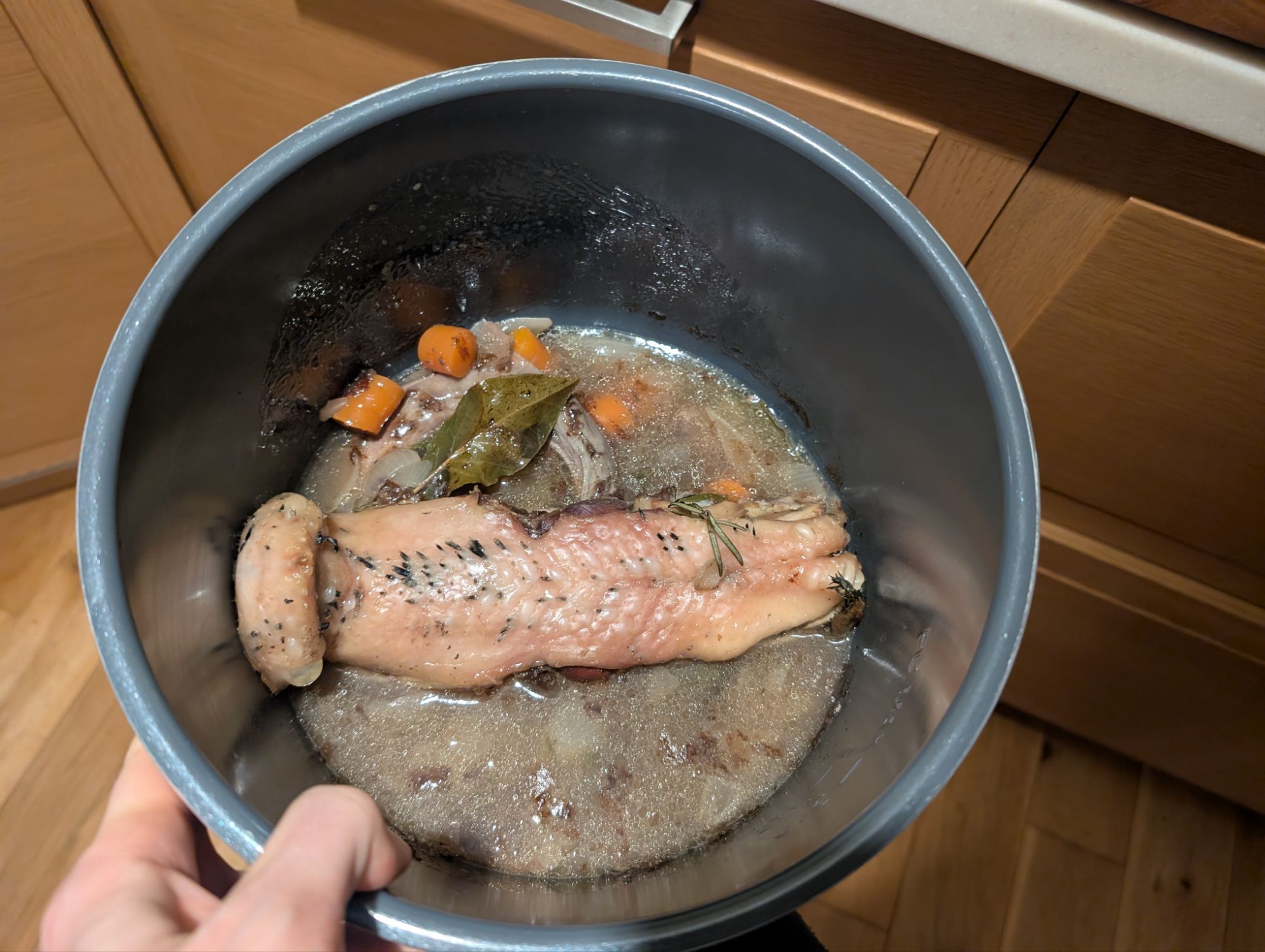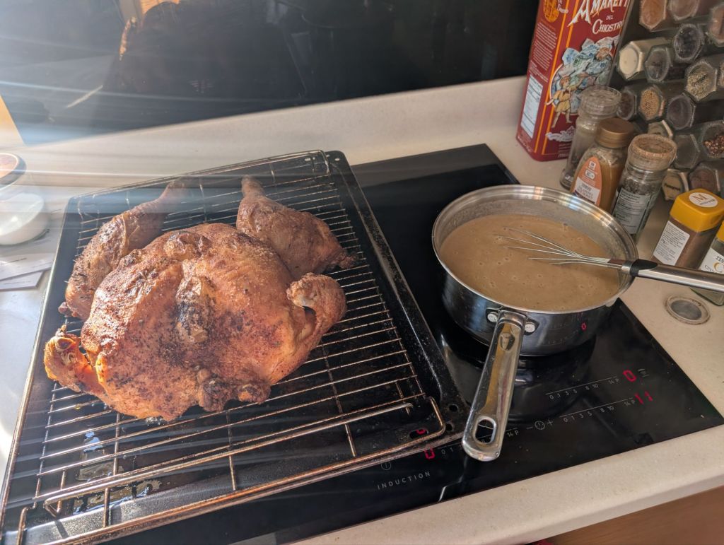 This year the starter was a twist on a traditional recipe. A gojuchang prawn cocktail, served over quick pickled cucumber and pomegranate seeds, with a side of wheaten bread. It was pleasant, although I put much less of the chilli paste in it than in the original recipe as I didn’t want to blow our heads off.