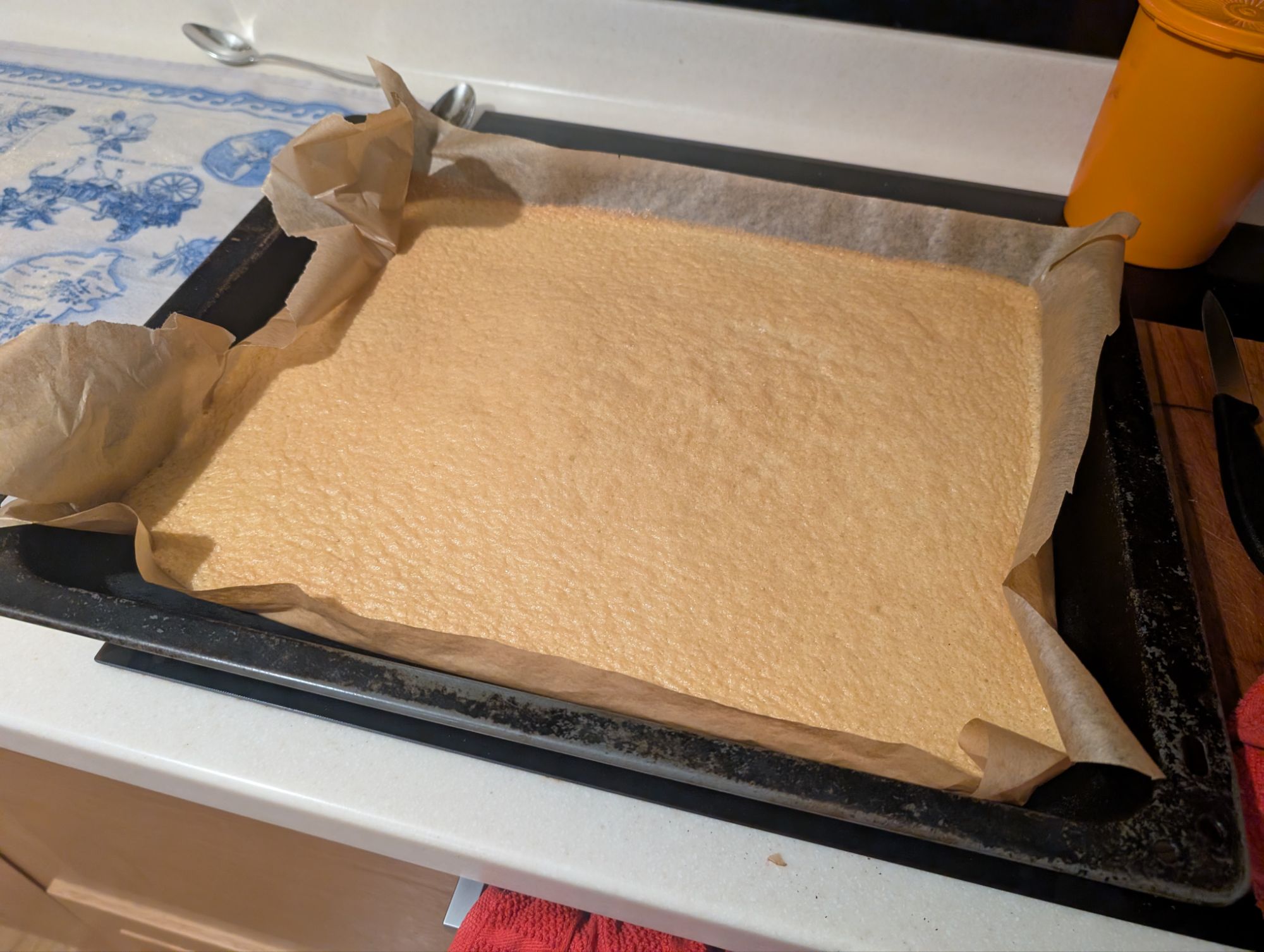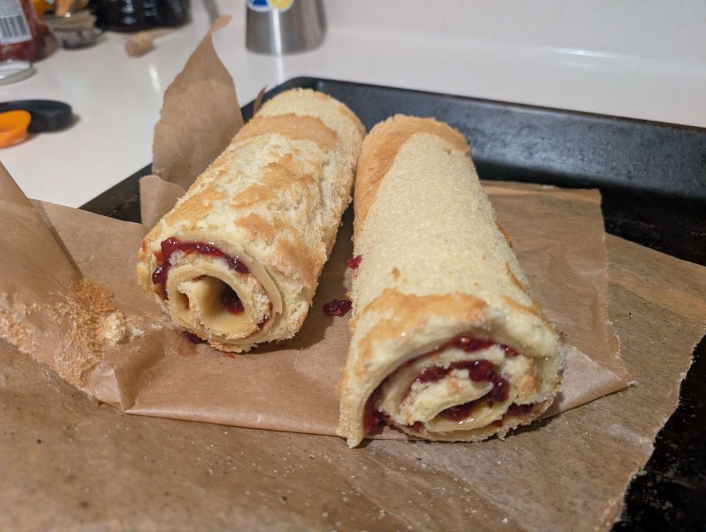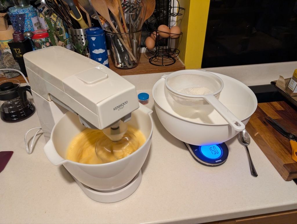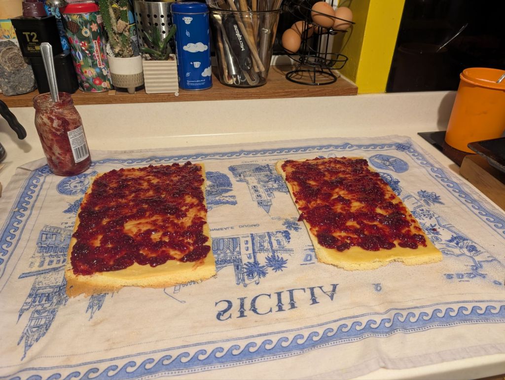 The sponge recipe used eight eggs (probably a red flag), and two swiss roll tins. I had precisely zero swiss roll tins, so I opted for the biggest roasting tin we owned. I did produce two sponges from this, but they were distinctly flat and relatively inelastic. Functional, but not as I had hoped.