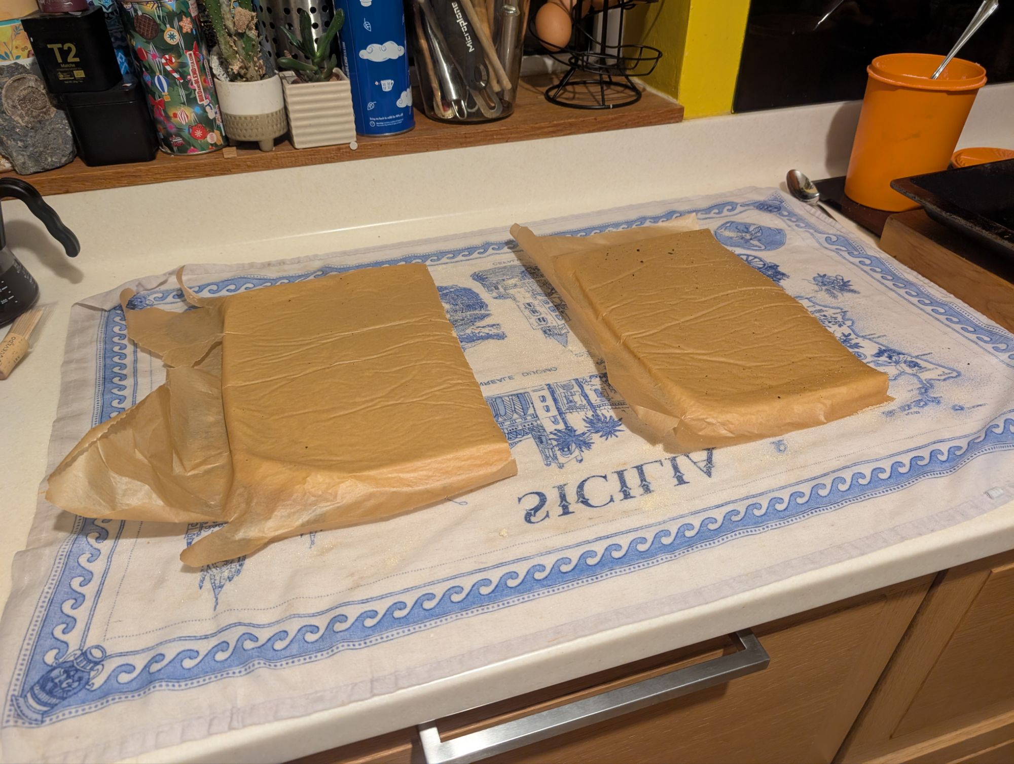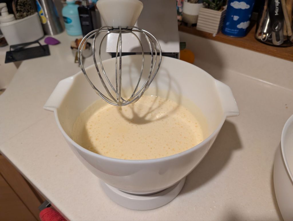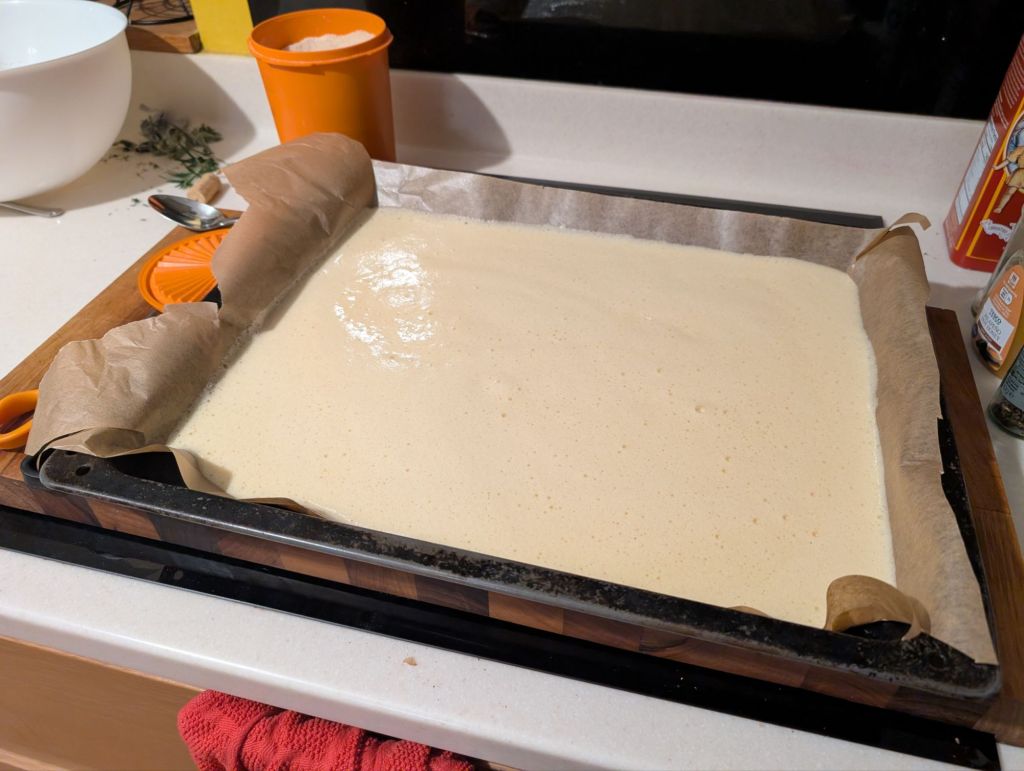 The sponge recipe used eight eggs (probably a red flag), and two swiss roll tins. I had precisely zero swiss roll tins, so I opted for the biggest roasting tin we owned. I did produce two sponges from this, but they were distinctly flat and relatively inelastic. Functional, but not as I had hoped.