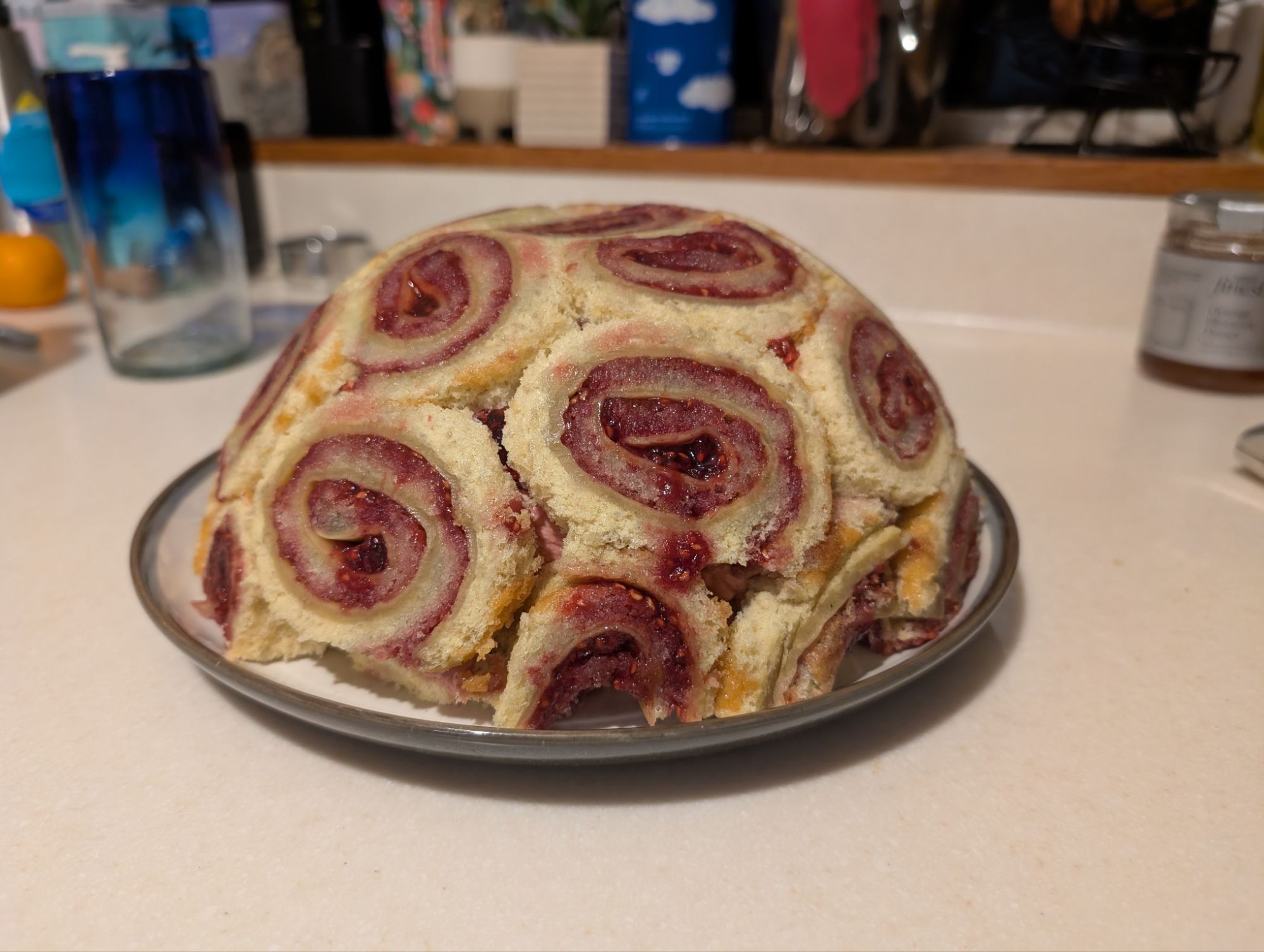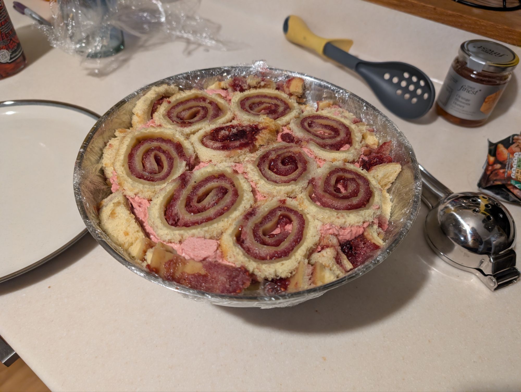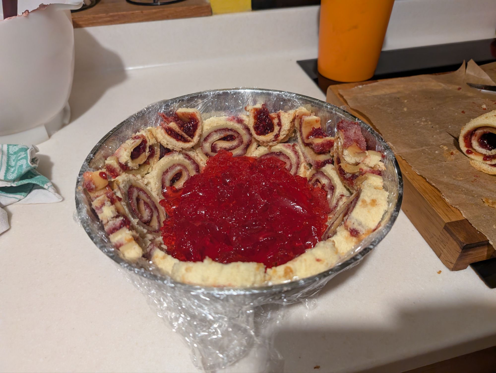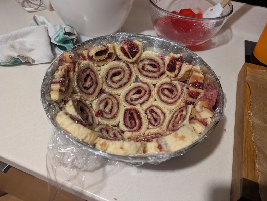 The swiss rolls were then sliced into 1cm rounds and used to line a (clingfilm-lined) bowl, then I added raspberry jelly and the bavarois. The whole thing was allowed to set in the fridge overnight, then turned out.
