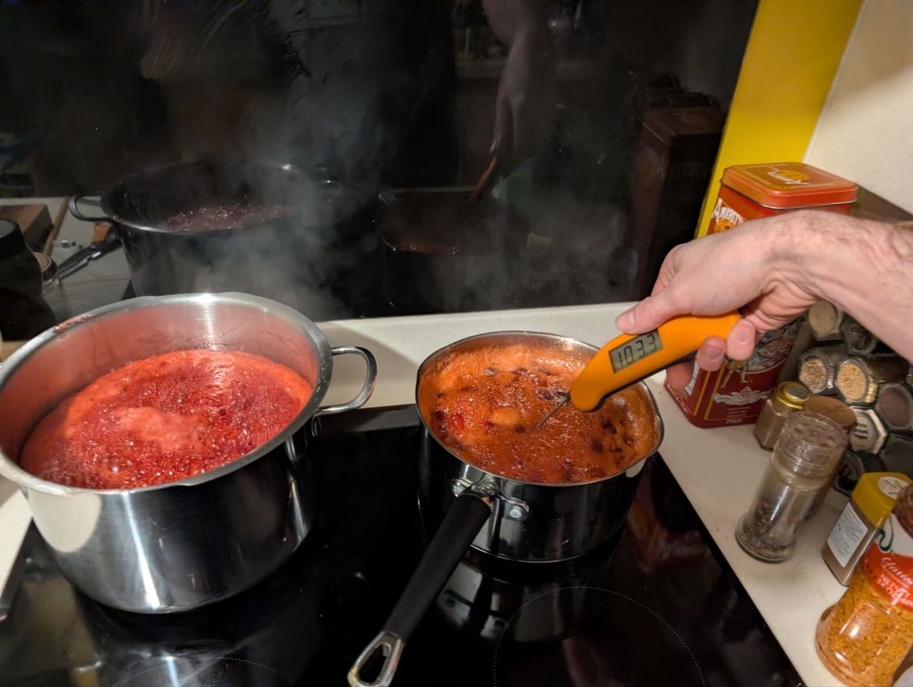 Thanks to my new Thermapen Classic it was (kind of) easier. It always amazes me how long it takes to go from 104 to 105 degrees Celsius. Surely it can’t be that hard, can it? There’s a reason you make jam in big pots. I was limited by the time I had to make it and access to tall-sided saucepans. The pasta pot was perfect, but with the other saucepan I had to titrate the temperature to get it so the jam would boil level with the top of the pot but not pour over the side. I managed it, just about. It did make it harder to hit the target temperature, but I got there in the end.